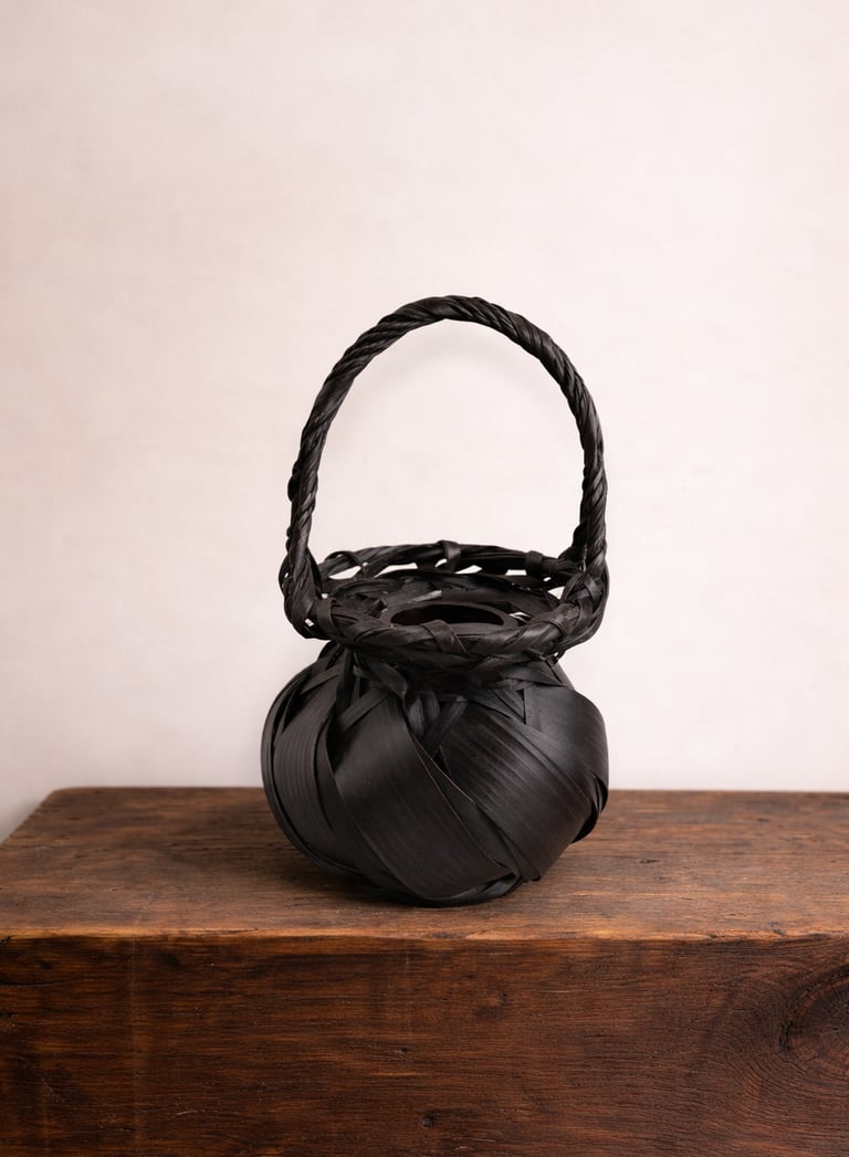 This impressive Meiji period hanakago (花籠, flower basket) is crafted in a bold, sculptural style. Its rounded, bulbous body is formed from broad overlapping bamboo strips, giving the basket a powerful sense of volume and movement. The braided bamboo handle and reinforced rim add strength and visual balance to the design.
