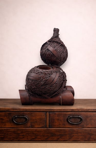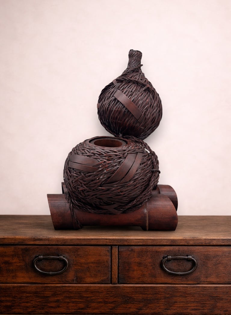 The “double gourd” form comes from tying the fruit in the middle while it grows. Once dried, the waist naturally provided a strong point to attach cords or lids, a detail faithfully imitated in bamboo basketry.