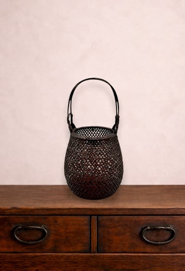 A charming small hanakago featuring an airy kagome (hexagonal) openwork body and a tall loop handle. Its compact size makes it ideal for intimate seasonal arrangements or as a refined accent in a tokonoma alcove. The simplicity of form and lightness of weave embody the Japanese taste for elegance in everyday objects.