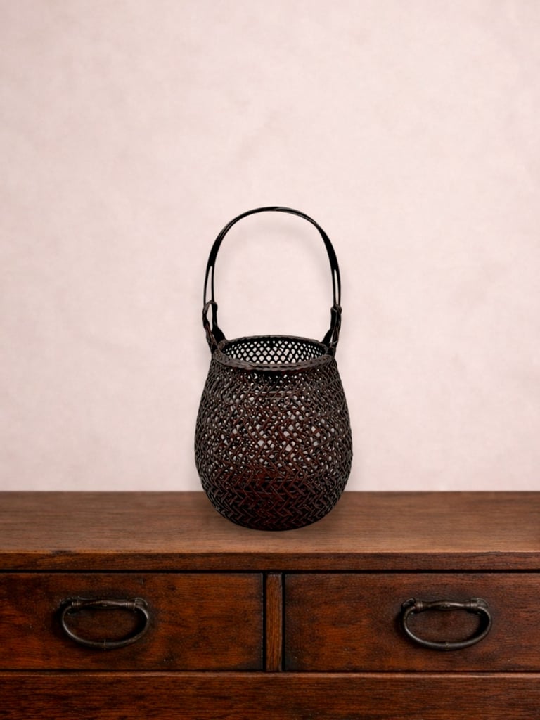 Compact hanakago were often used for seasonal wildflowers (野の花), reflecting the wabi-sabi appreciation for transience and simplicity in Japanese aesthetics. Their modest size made them suitable for everyday tokonoma displays.