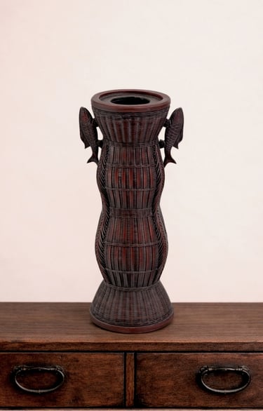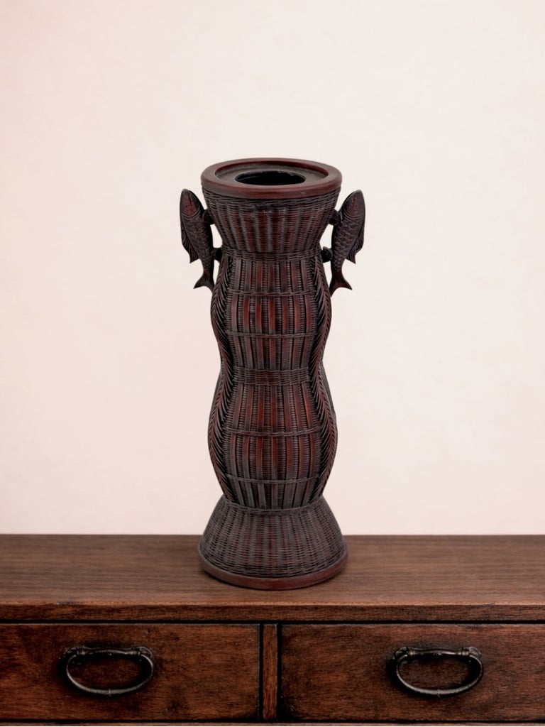 What makes this piece unique are the applied fish ornaments (tai 鯛) on the shoulders. The sea bream (tai) is a symbol of good fortune and celebration in Japan, often associated with prosperity and festive occasions. The basket’s clean lines and decorative motifs make it equally suitable for ikebana or as a display piece.