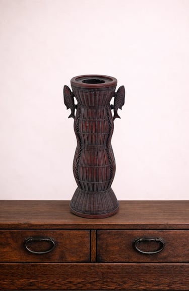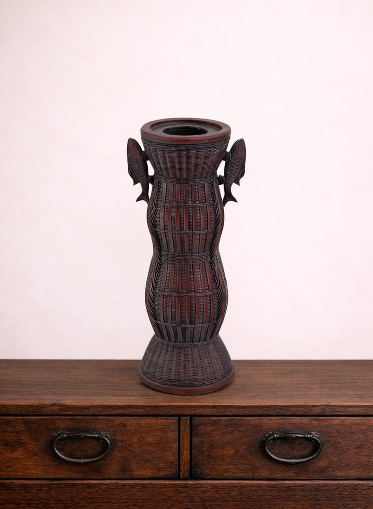What makes this piece unique are the applied fish ornaments (tai 鯛) on the shoulders. The sea bream (tai) is a symbol of good fortune and celebration in Japan, often associated with prosperity and festive occasions. The basket’s clean lines and decorative motifs make it equally suitable for ikebana or as a display piece.