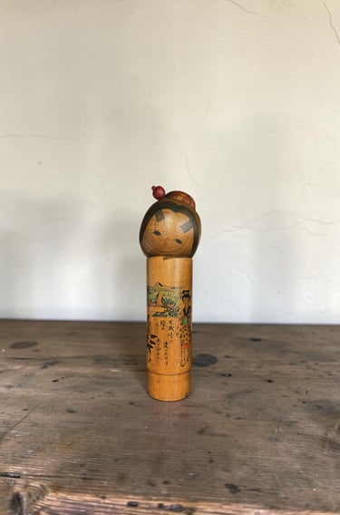 Unlike more traditional kokeshi, this piece was created as a souvenir, capturing both place and narrative. Its warm wood tone and gently aged surface enhance its nostalgic character, making it a charming representation of mid-20th century Japanese travel culture.