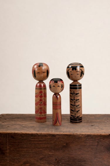 This set brings together three vintage kokeshi dolls, each with its own proportions, expression, and decorative language. The taller figures contrast with the more delicate central piece, creating a balanced and quietly engaging composition.