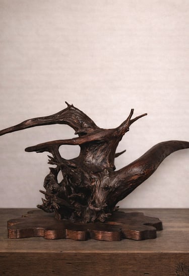 This imposing sculpture is formed from a large section of natural root wood, selected for its striking and dynamic shape. The extended branches and flowing lines create a powerful sense of movement, giving the piece an almost animated presence.