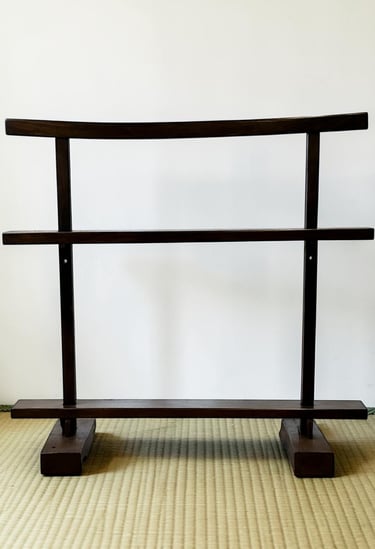 This large freestanding wooden structure presents a striking and unusual example of Japanese display furniture. While its form may recall traditional kimono racks (ikō), its proportions and construction suggest a different purpose.