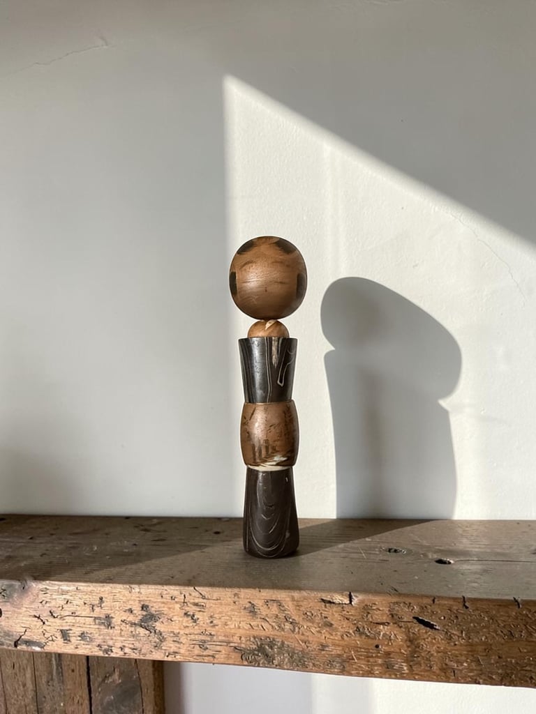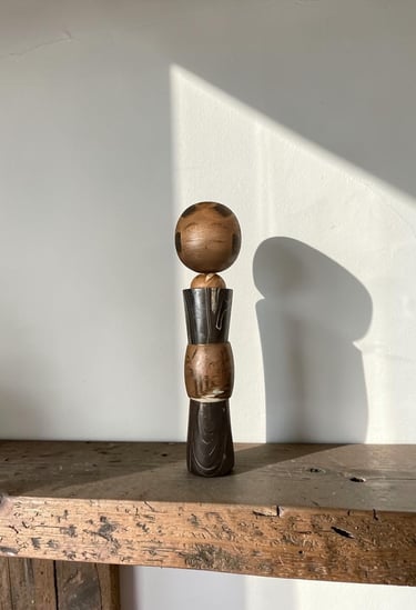 This unusual doll departs from traditional kokeshi forms, offering a more sculptural and expressive interpretation. Its segmented structure and contrasting wood tones create a layered composition, where each section contributes to the overall balance of the piece.