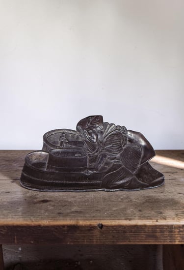 This small cast metal object presents a finely modeled scene of a woman engaged in daily work, likely using a traditional grinding mill. The composition is both intimate and expressive, capturing a quiet moment of everyday life with remarkable presence despite its modest scale.