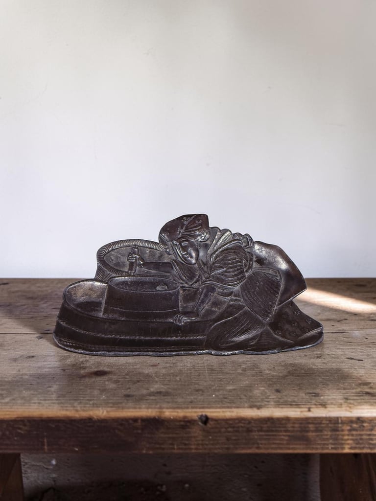 More than a utilitarian object, this piece reads as a sculptural relief. The figure, tools, and surrounding forms emerge gently from the surface, extending slightly beyond the rim and even onto the underside, creating a continuous composition that reinforces the object’s sculptural character.
