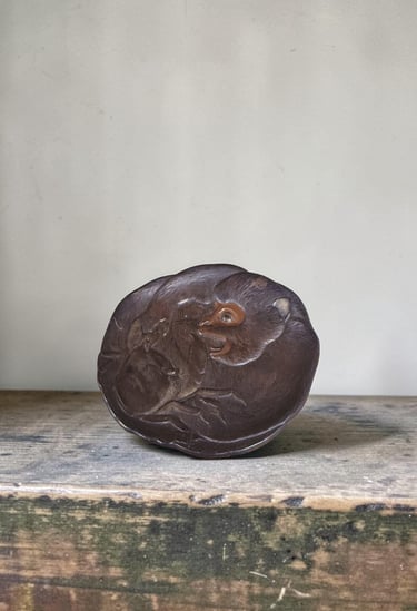 The surface displays a deep, naturally developed patina, with soft tonal variations that enhance the relief and give the piece a quiet depth. The reverse is also worked, with decorative elements extending beneath the plate, reinforcing the impression of a carefully crafted object rather than a purely functional item.