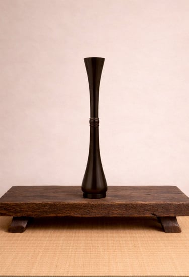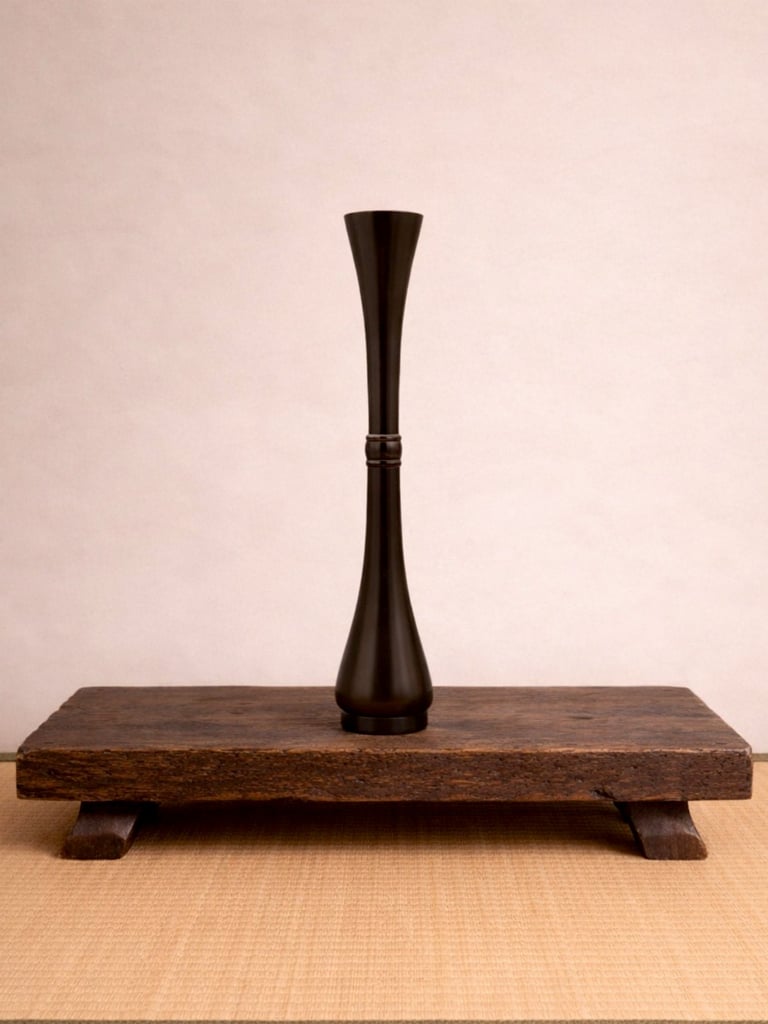 Its dark patinated surface enhances the purity of the form, allowing light to softly glide along its contours. The restraint in decoration reflects a refined aesthetic where proportion and material take precedence over ornament. Perfectly suited for a single stem or a minimal ikebana arrangement, this vase embodies a quiet sophistication that integrates naturally into both traditional and contemporary interiors.