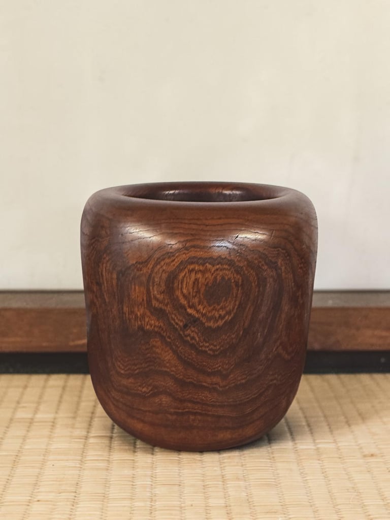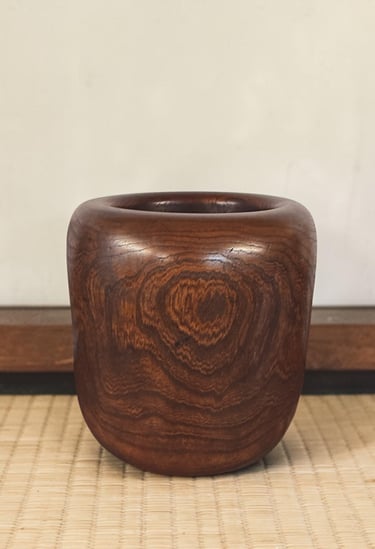 Its compact and softly rounded form reflects its original purpose as a small personal hand warmer, used when one was away from a larger hibachi. The fitted copper insert allowed it to safely contain ash and embers, while the wooden exterior softened the object visually and thermally, making it suitable for domestic use.