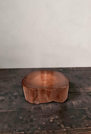 This small Japanese wooden dai (display stand) is carved from a dense hardwood, likely a fruit tree species, selected for its fine grain and warm tonal variations. The form follows an organic outline, with softly irregular contours that give the piece a natural, almost sculptural presence. The surface reveals a rich patina, highlighting the depth and movement of the wood.