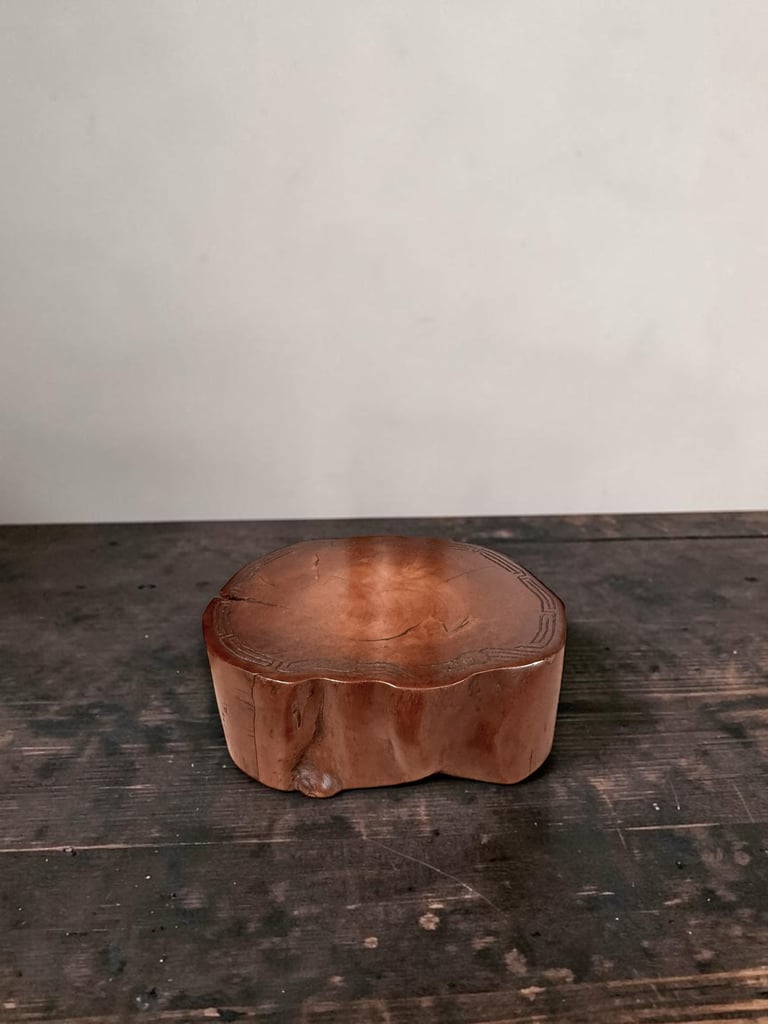 A discreet engraved decoration runs along the upper edge, adding a refined graphic element without disturbing the overall simplicity. Compact in scale, it was likely used to elevate and present small objects — possibly a decorative item, incense burner, or small sculpture — rather than serving a strictly functional role.