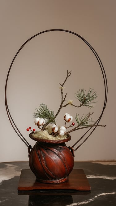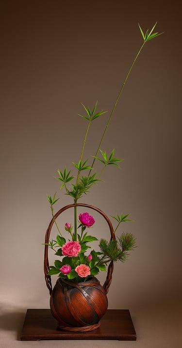 Dans la pratique de l’ikebana, le hanakago est souvent utilisé pour les compositions nageire (style libre et naturel) ou dans les écoles comme Sōgetsu ou Ichiyō, qui favorisent l’expression personnelle.